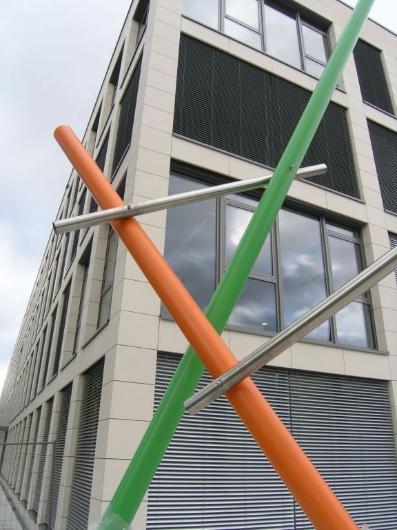 Als Highlight dient das mittig horizontal positionierte Teilelement des Kunstwerkes, als Form der sozialen Plastik, auch als Sitzgelegenheit.