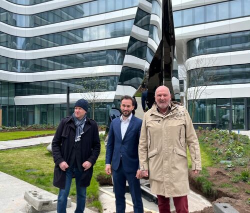 700 kg Edelstahl, die federleicht wirken, als ob sie gleich abheben. Der „Senkrechtstarter“, der im Rahmen des von EUROPA-CENTER ausgerufenen und durch KUNST RAUM KONZEPTE Dirk Monreal betreuten Wettbewerbs „Kunst und Bau“ zur Außengestaltung des FLOW EUROPA-CENTER Frankfurt Gateway Gardens als Sieger hervorging, zieht dort ab sofort alle Blicke auf sich. Die rund 6 m hohe Papierflieger-Skulptur von Peter Sandhaus wurde jetzt auf dem Gelände des innovativen Campus in Frankfurts Zukunftsquartier offiziell eingeweiht. Ralf-Jörg Kadenbach, Vorstandsvorsitzender der EUROPA-CENTER AG: „Mit dem FLOW EUROPA-CENTER Frankfurt Gateway Gardens, unserem Masterpiece in Motion, stellen wir 2023 eine ‚Next Generation‘-Immobilie im Herzen Europas, direkt am Frankfurter Flughafen, fertig. Der Name ist Programm und zeigt sich nicht nur in der schwungvoll fließenden Fassadenform der zwei zusammenhängenden Gebäude, sondern spiegelt gleichzeitig die Dynamik zwischen den geplanten Büro- und Gastronomieflächen wider, die durch einen eigenen Campus verbunden sind. Papierflieger stehen für grenzenlose Freiheit, aber auch für Forschungs- und Entwicklungsdrang, angefangen bei Kindern und deren